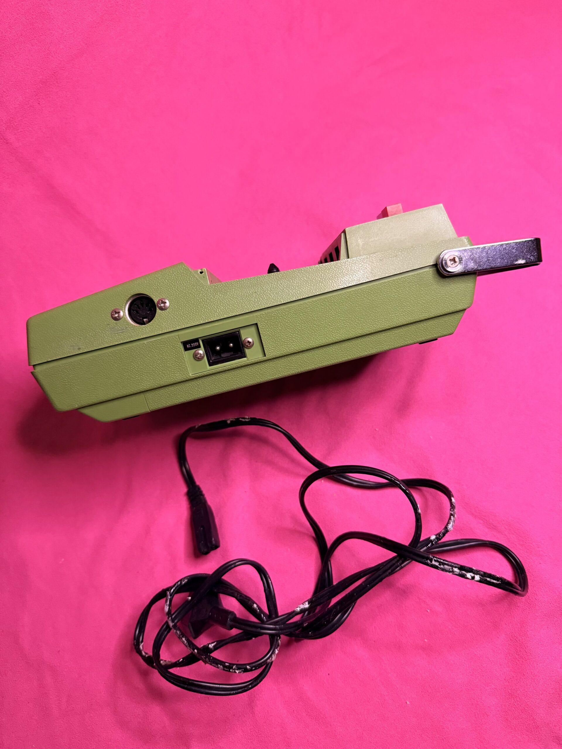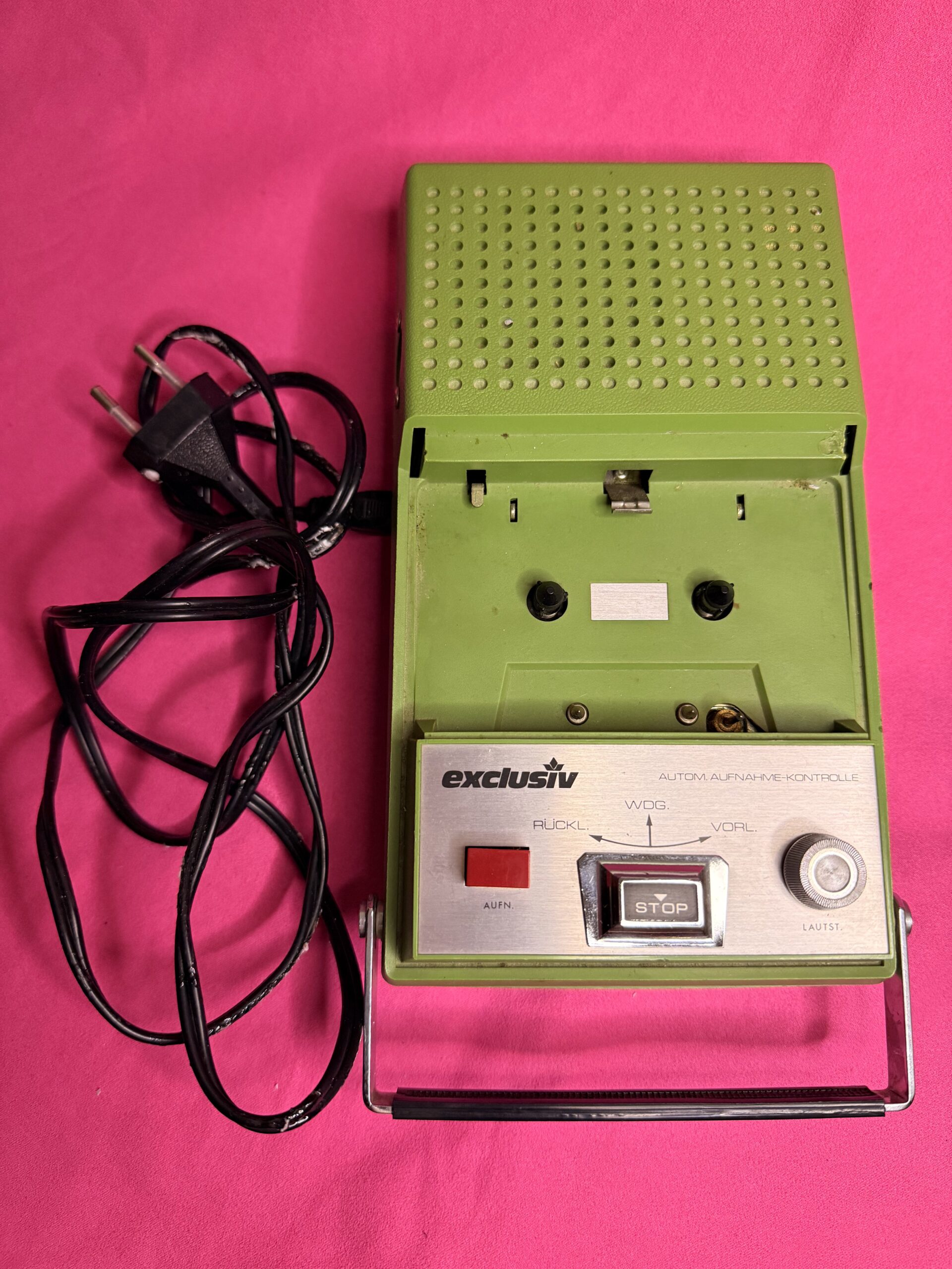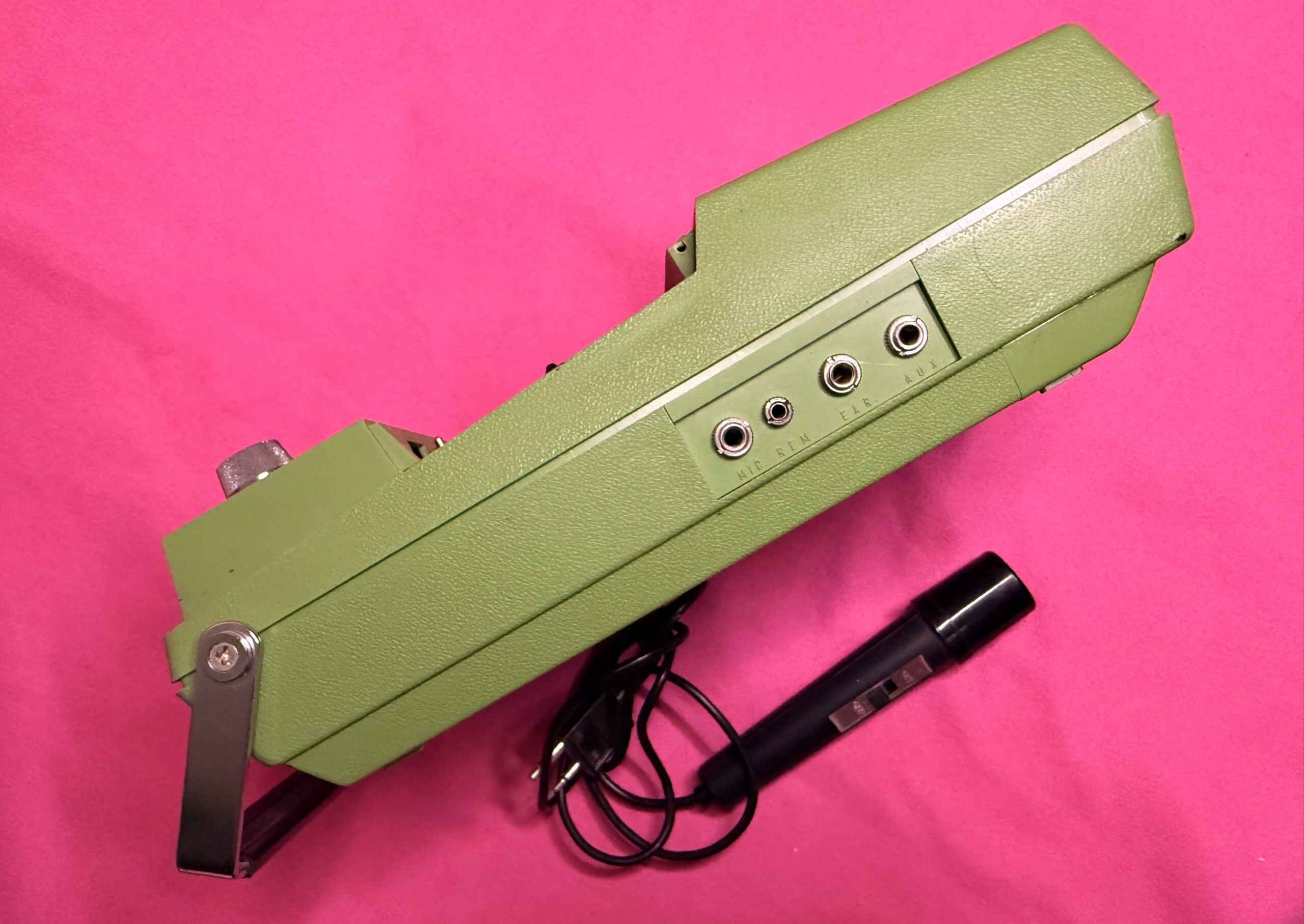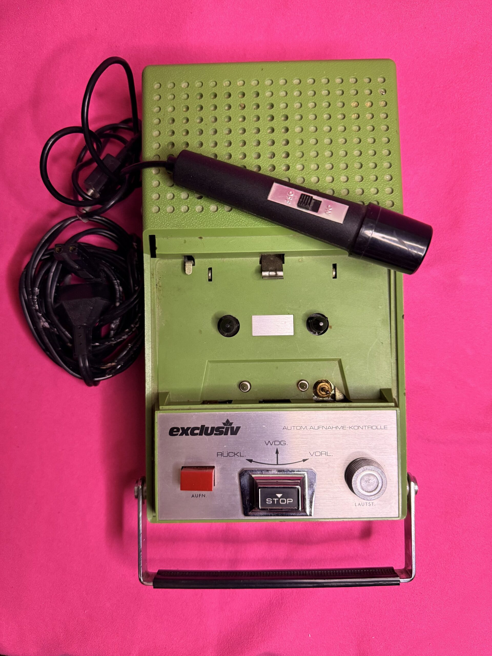 Retro tape recorder from the 1970s–80s, complete with original wired microphone and accessories. A charming piece of analog technology, perfect for collectors, vintage audio enthusiasts, or as a unique decorative item.